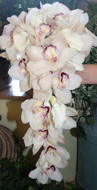 Cymbidium orchids and mini calla lilies.Every orchid was hand